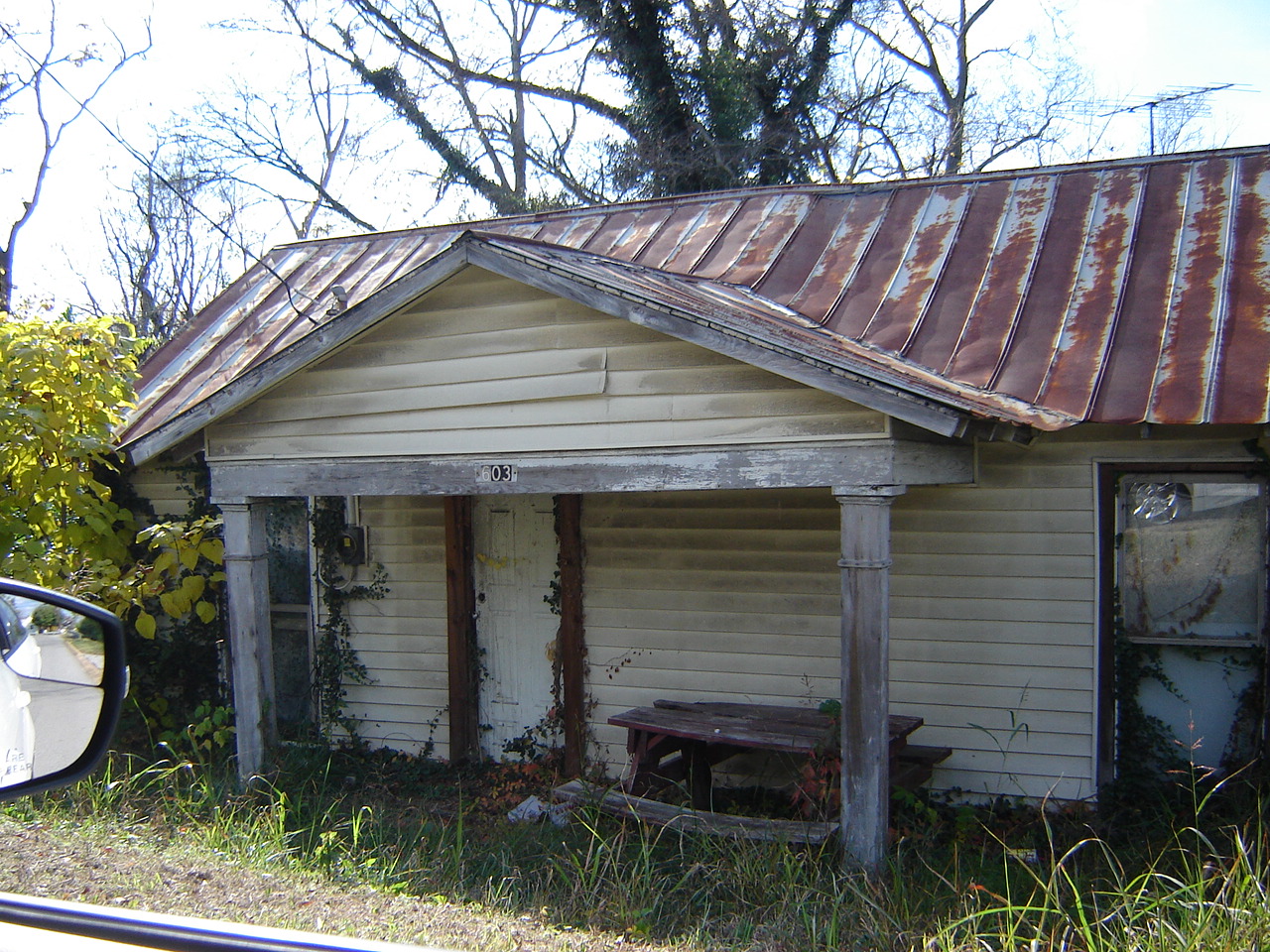We followed Adam’s directions a few blocks west to scout our own impressions of the Mink Slide today. George and I weren’t surprised that Columbia did nothing to identify the site or remember it publicly. The watchful/wary reception my question inspired at the library still embarrassed me, making me feel every inch the intruding Yankee blundering, uninvited, through Dixie. Still, the short stretch between the library and Mink Slide was its own monument, a sad one erected not by hands but by hands off, decades of neglect. Blocks of soaped-over shops, weedy lots, abandoned gas stations and warehouses, shut-down businesses in an old brick storefronts led past a faded sign, “Dump’s Café,” and to the corner of West 8th and Main. Here was