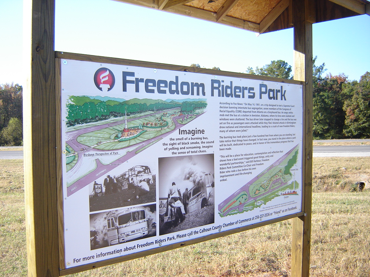 Further south, we were about to find modern Klan types still busy trying to destroy commemoration of civil rights struggle. George would soon return to Colorado, while my other writing partner, Kristen, would arrive to join me down in Alabama. In Anniston, the little city famous for the fiery 1961 attack against Freedom Riders, Kristen and I would arrive the day before a new fire was set ablaze.