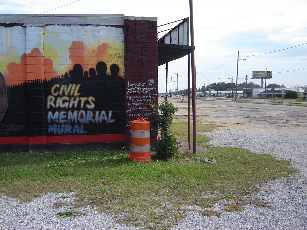 We’d walked along Noble Street where the buses had pulled in at the old bus depot. Unexceptional buildings stood unchanged on the empty street as we read the mural in the glassy autumn sunlight. We could imagine being on the bus, looking out the window at pretty little downtown Anniston, thinking maybe Alabama won’t be so bad, our optimism cut short by the nightmarish sight and sounds of the gathering mob. Fifty-one years ago the storefront windows had reflected the KKK-led factory workers and shop clerks turned criminals as they slashed tires, shouted epithets, threw rocks, and beat people for sitting together on a bus, for riding towards a New South…
