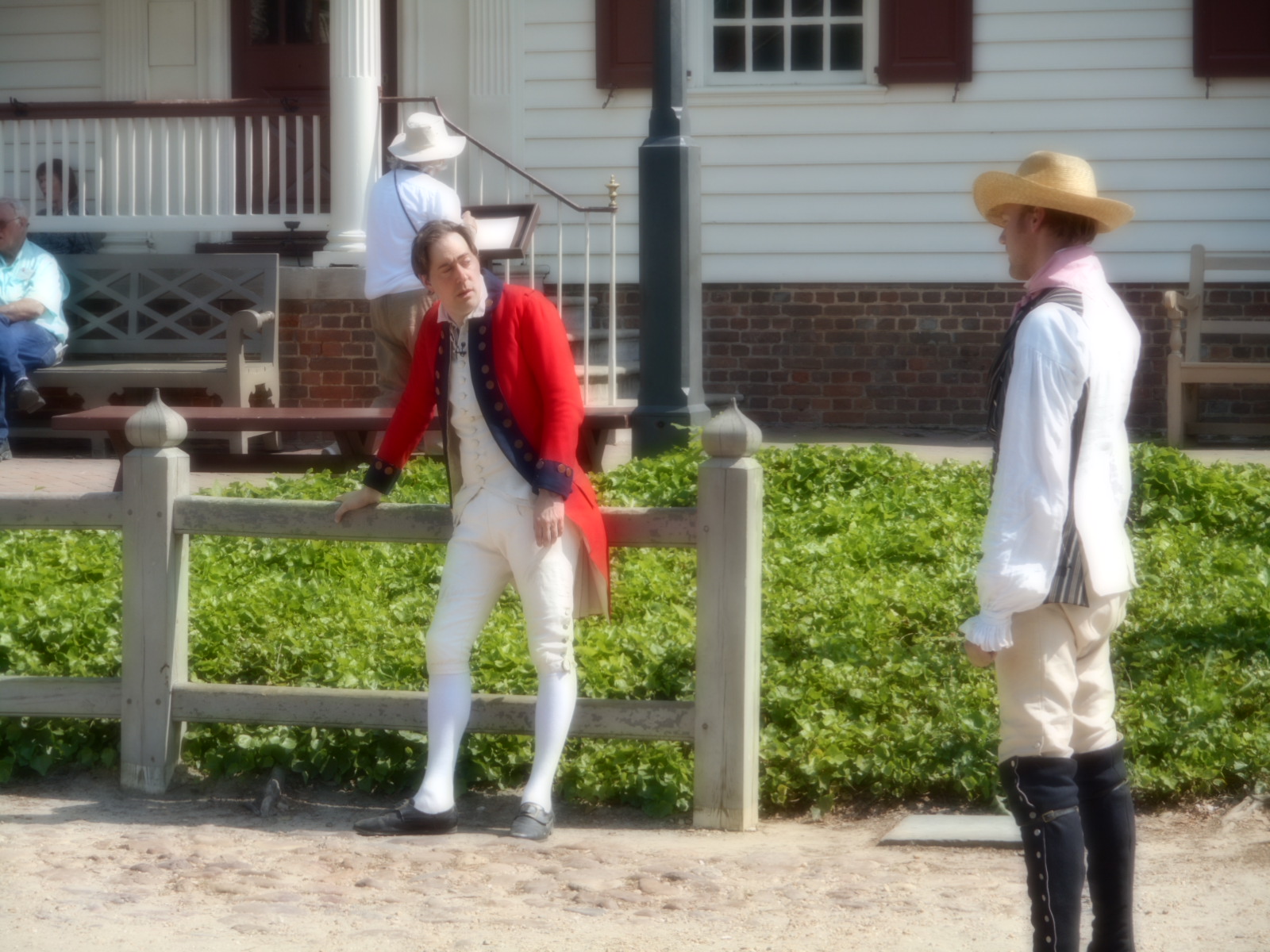 As George and I took leave of Aubrey and strolled to the Capitol, we became enmeshed in a staged drama that began at the gates and then unfolded beside and all around us. Costumed advocates for independence read proclamations from the Continental Congress, while colonists gave impassioned speeches farther down the main street against the royal menace. The acting and costumes were credible enough to keep the whole Colonial Williamsburg shebang from descending into cheesy melodrama. The street staging intensified with the dramatic return of a young local man who was regarded as a spy for the Crown.
