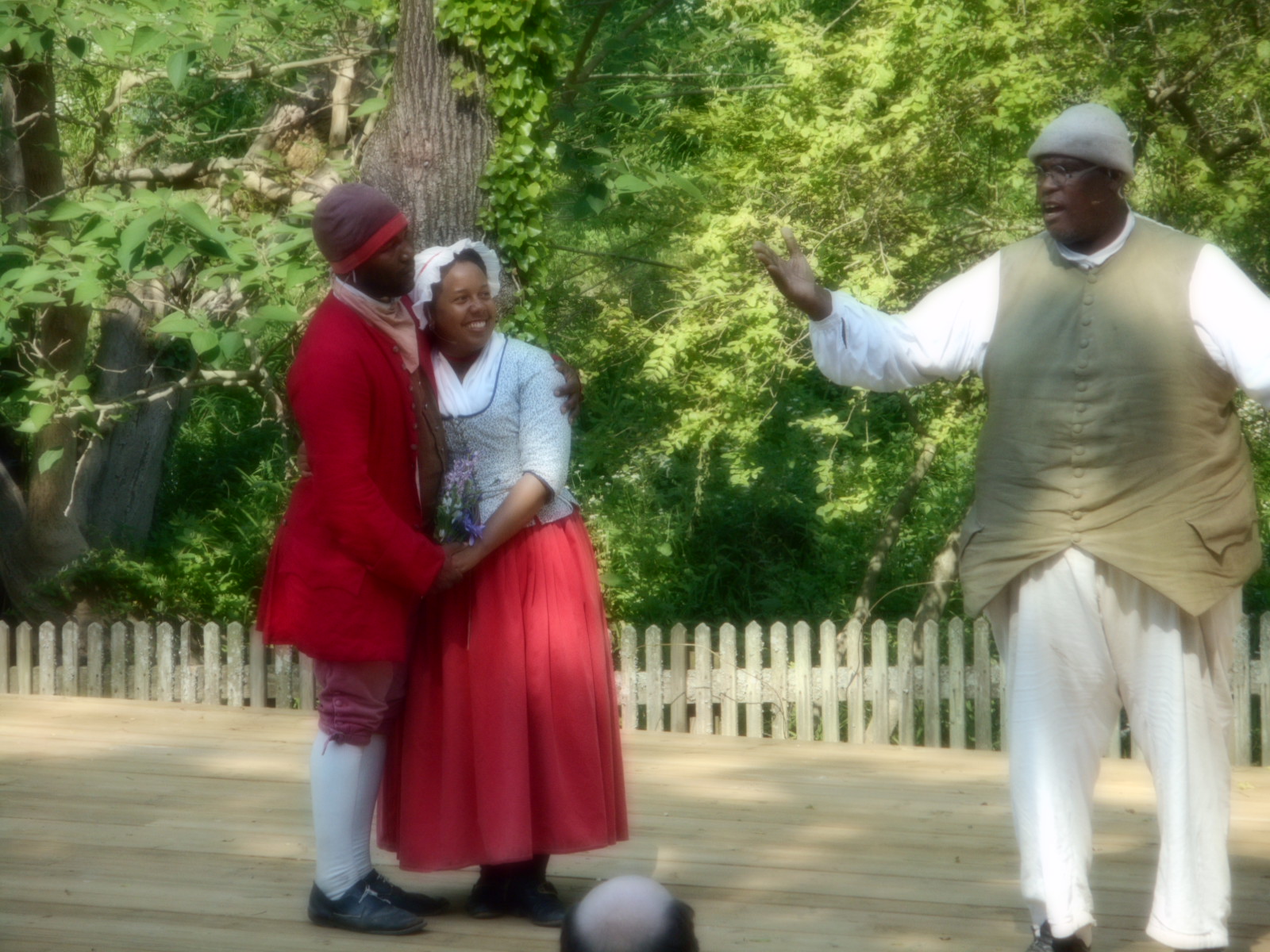 I appreciated the tone of doubt, debate, and fog-of-war contestation; nothing was simplified, nor were we persuaded to cheer the American Pageant version (though some visitors, prodded by actors, did call for the young man to be hanged). Out of this tumult, a much more intimate drama unfolded down the street between two slaves, Agnes and Jack, who were romancing each other but were haunted by losses of their former partners—Jack’s wife and child sold away to unknown locale and Agnes’ husband gone to an early death. After we witnessed their uneasy back-and-forth, in which their deprivations molded their wariness, we were joyously led to a stage where Jack and Agnes jumped the broom.
