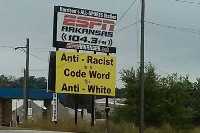 Huh? Maybe the weak motel coffee couldn’t wake our brains, but after a glance George and I didn’t really get the message. Then it dawned on us the billboard was accusing racial harmony advocates of attacking white people. Weird in a virtually all-white town.